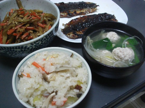 この日はさんまの開き(みりん干)、豆腐団子のスープ、きんぴらごぼうと