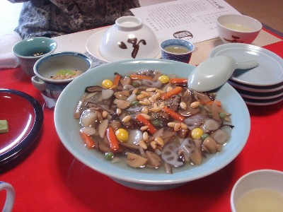 息子が食いついたあんかけ。根菜類や山菜が入っていて上品な味。